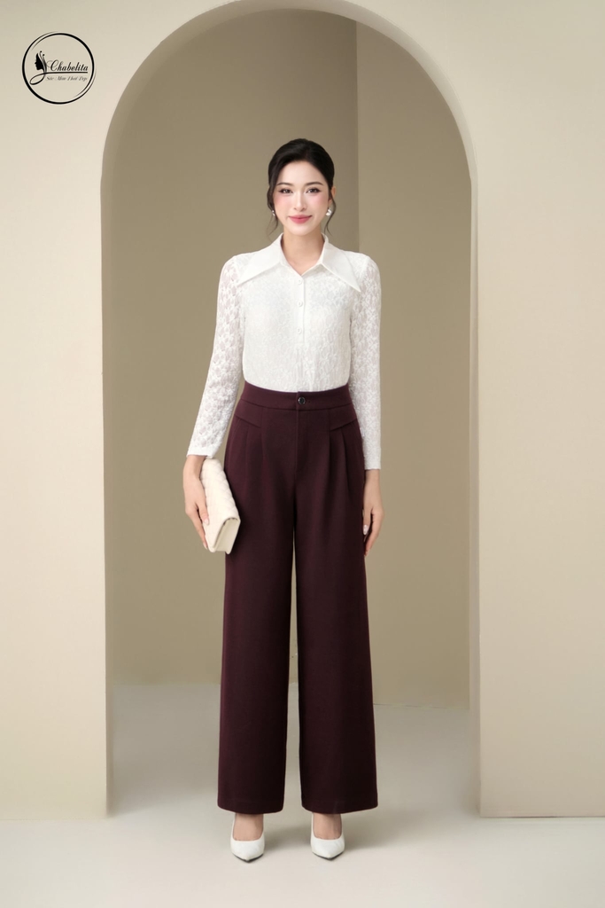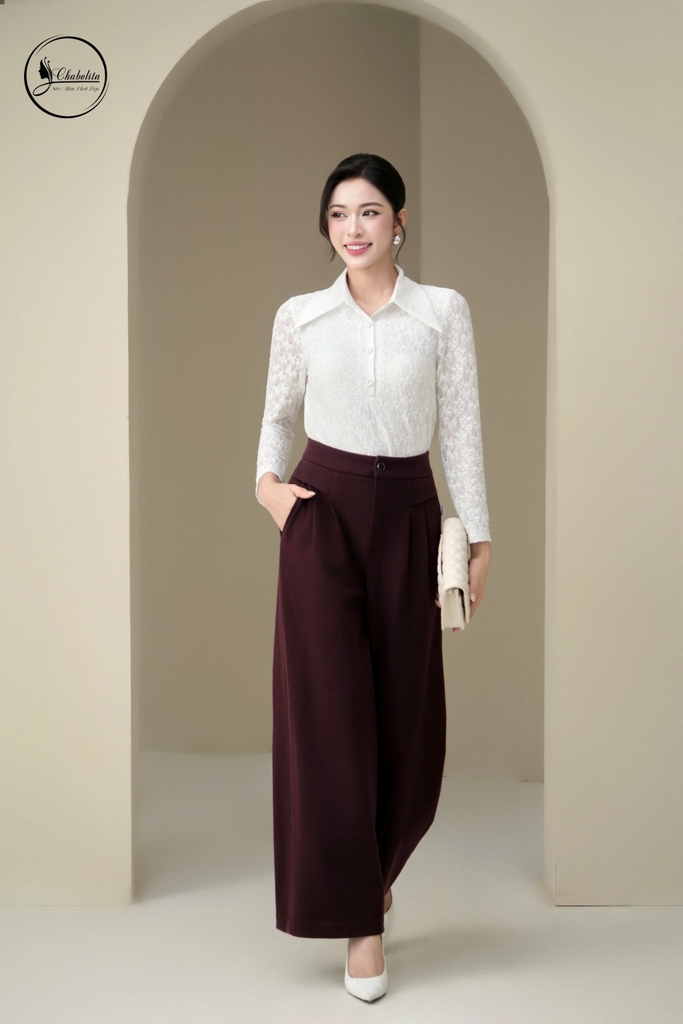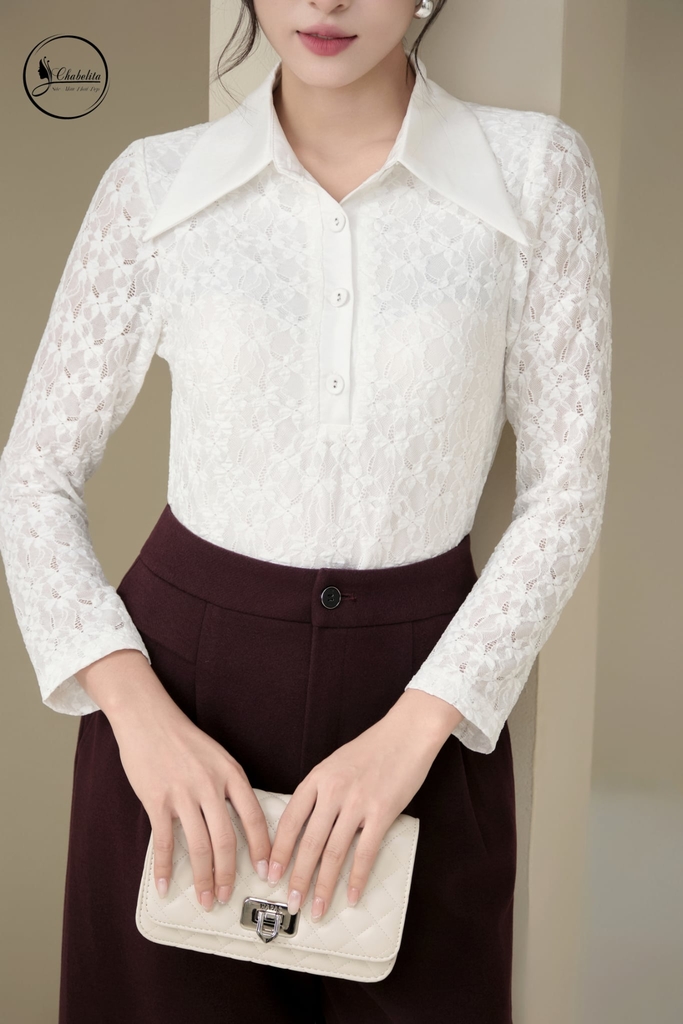 Áo ren dài tay phối cổ nhọn màu trắng