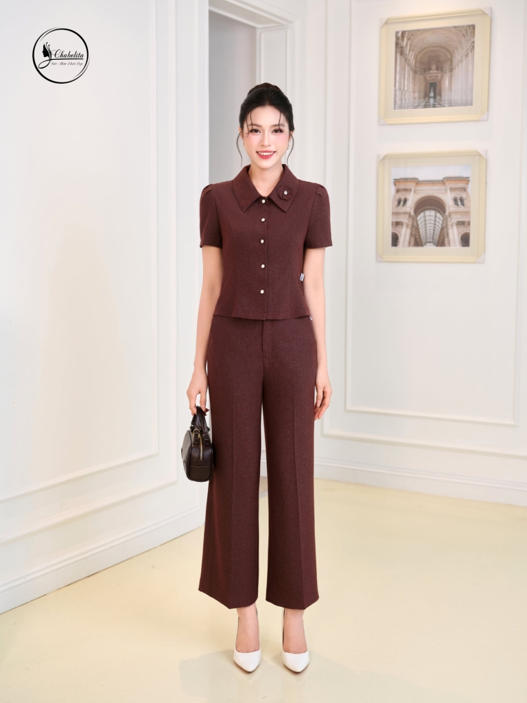 Áo sơ mi cổ đức đính hoa màu đỏ gạch