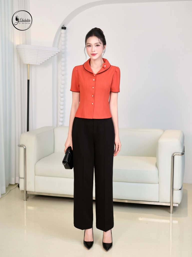 Áo sơ mi cổ sen phối viền màu đen