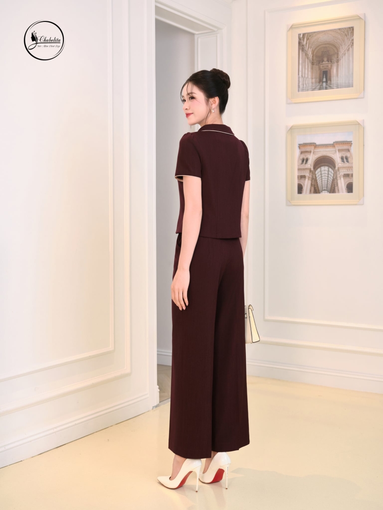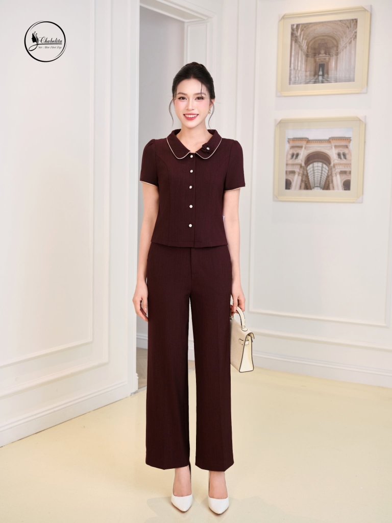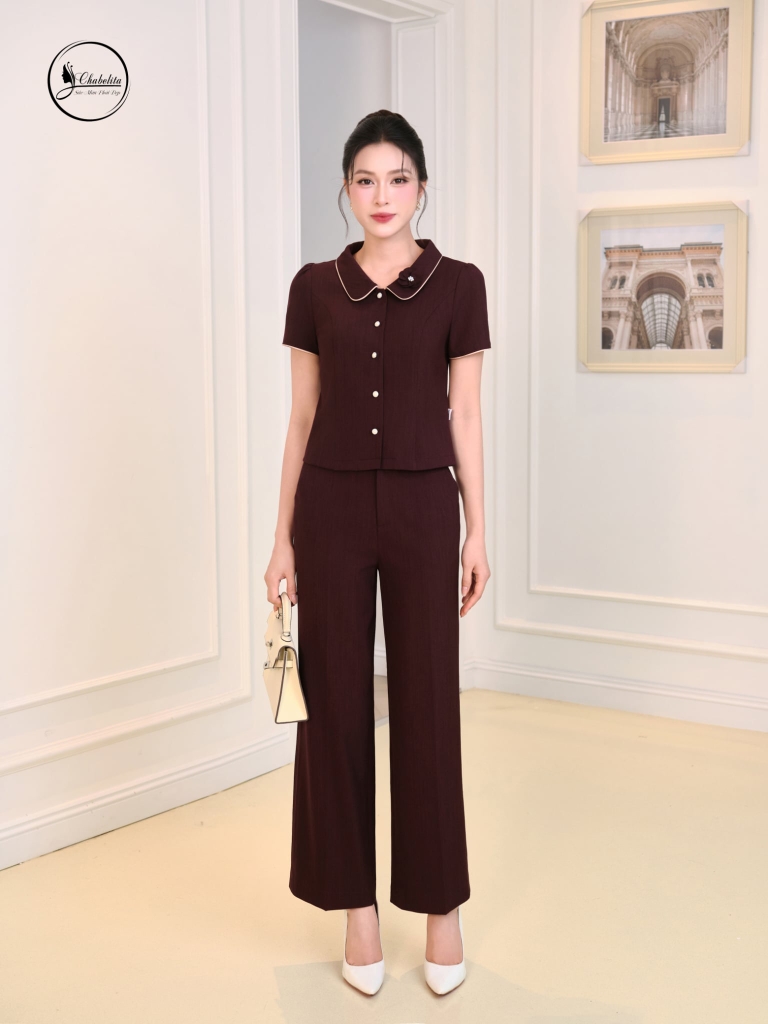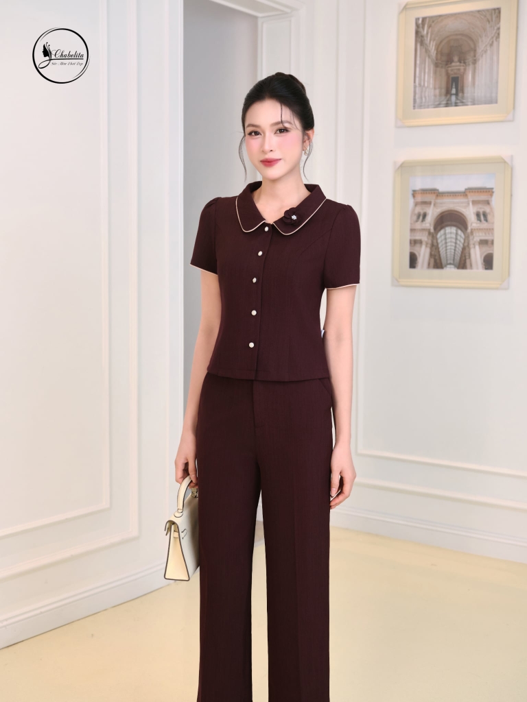 Áo sơ mi cổ sen phối viền đính hoa màu tím