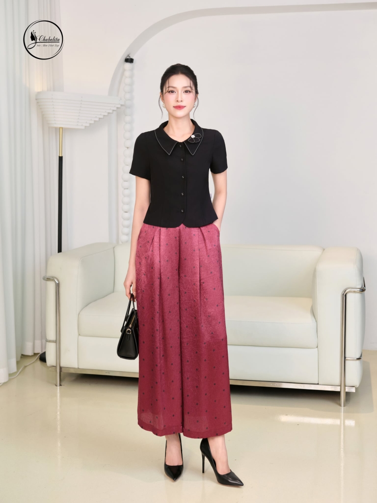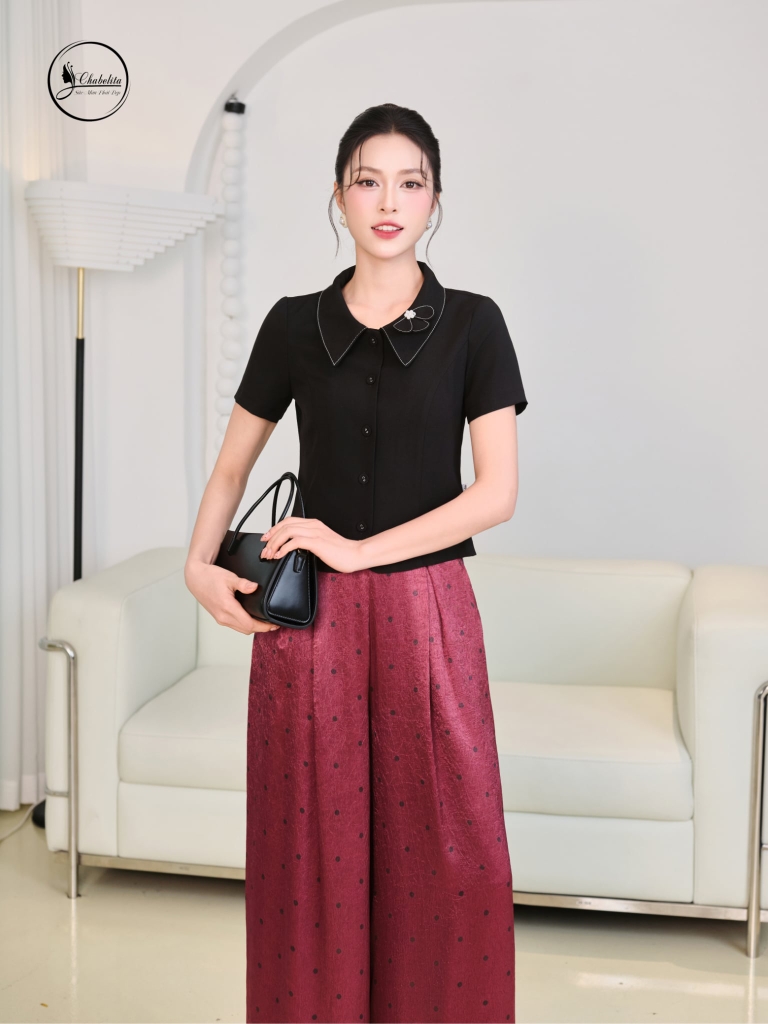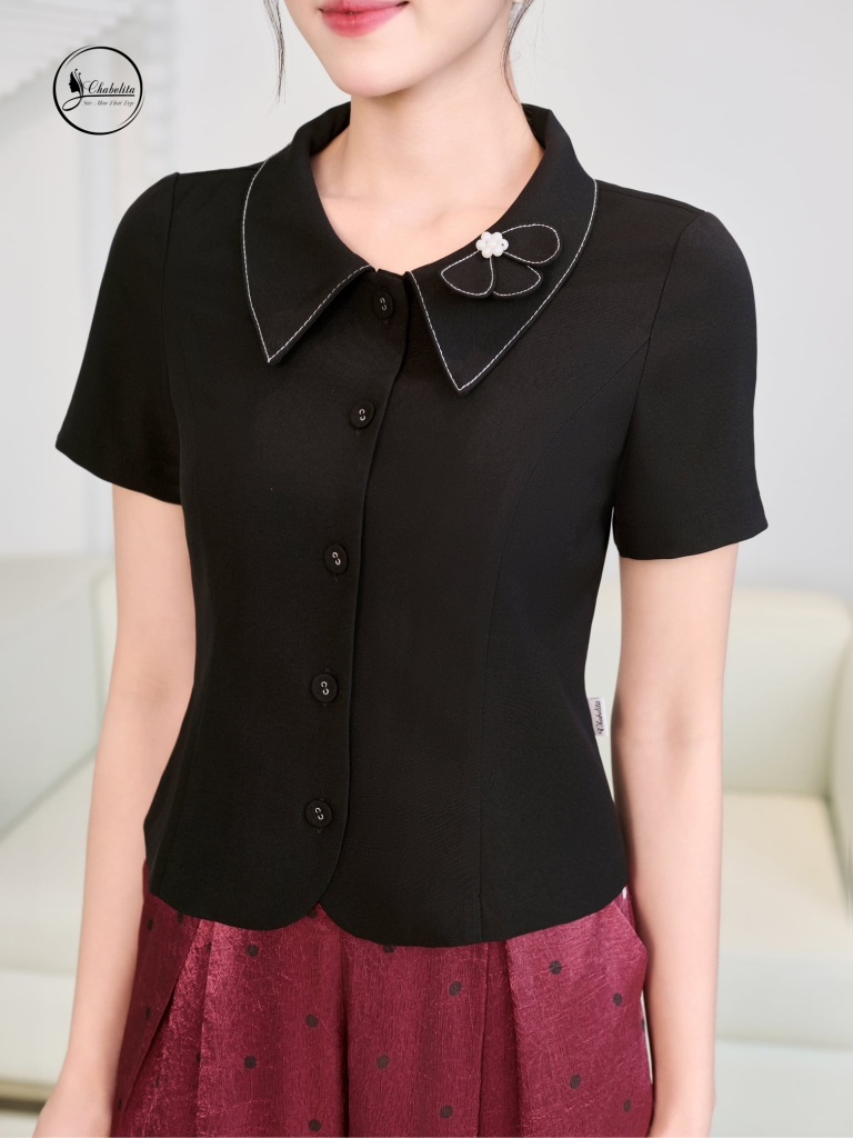 Áo sơ mi cổ sen phối viền đính hoa màu tím