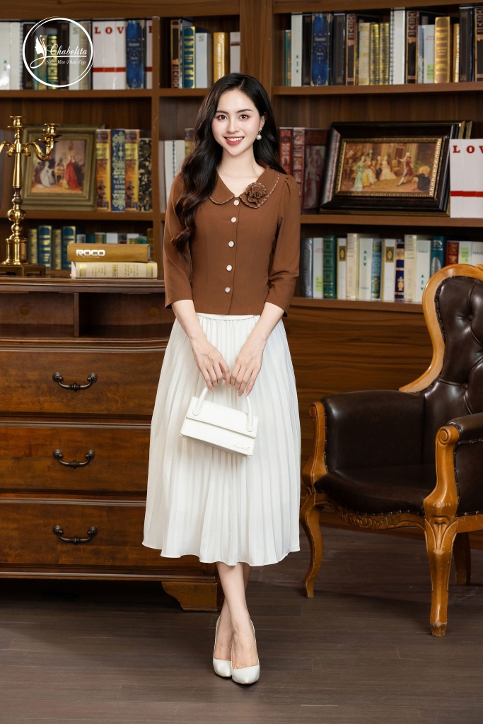Áo ký giả cổ bẻ đính hoa màu nâu