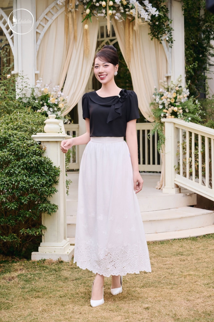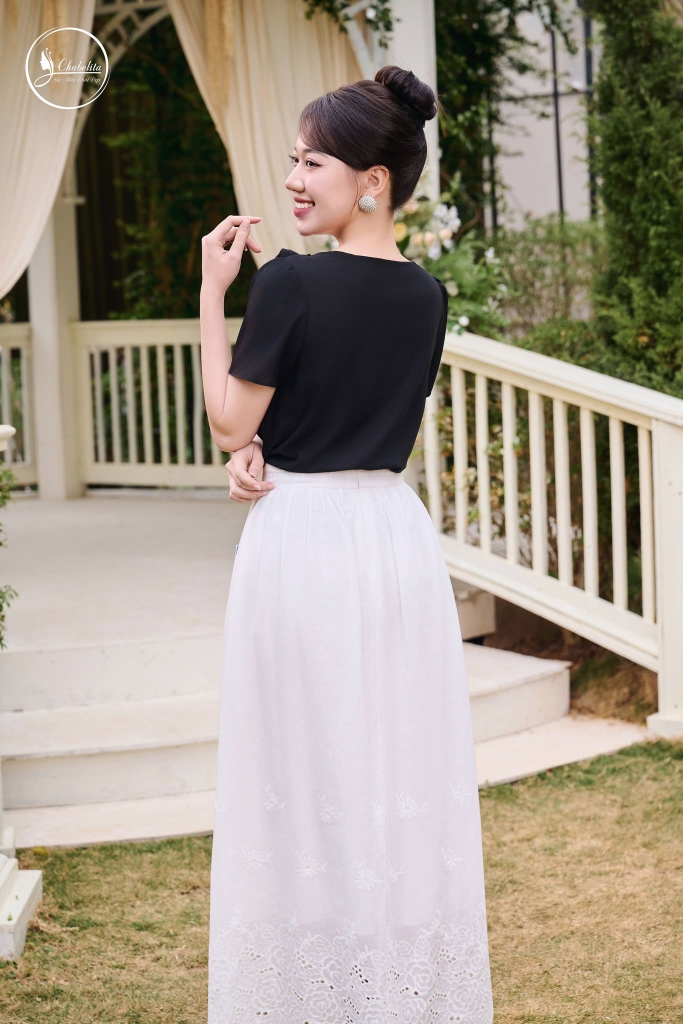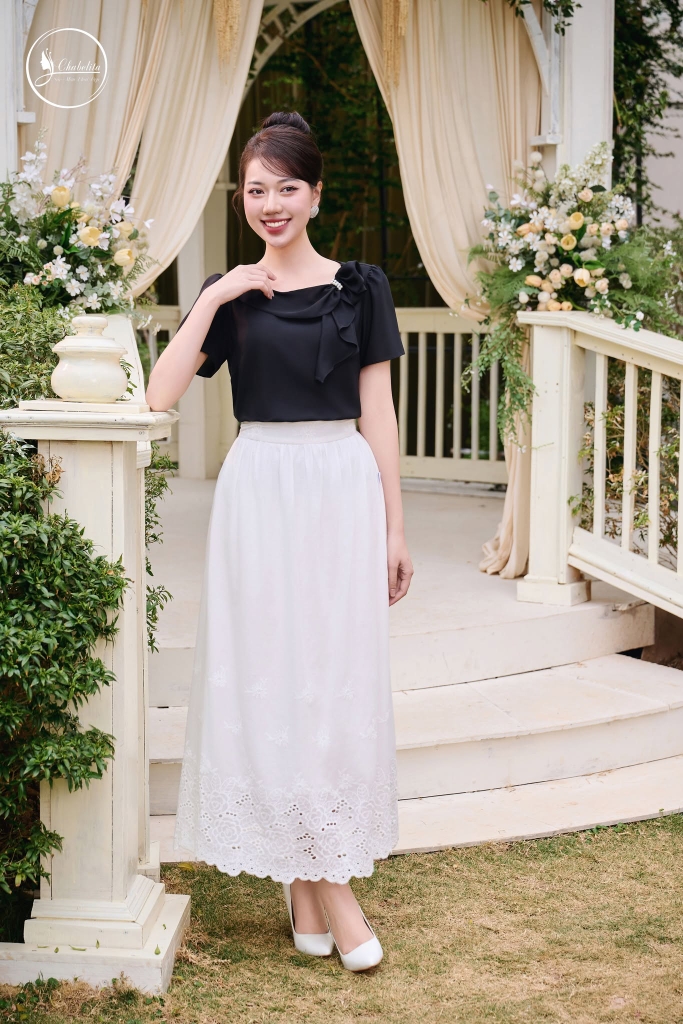 Áo sơ mi tay lỡ cổ tròn đính hoa màu trắng