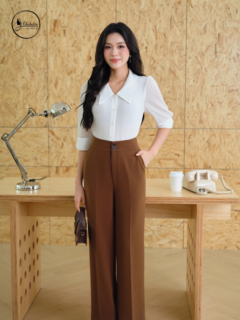 Áo sơ mi tay lỡ cổ tròn đính hoa màu trắng