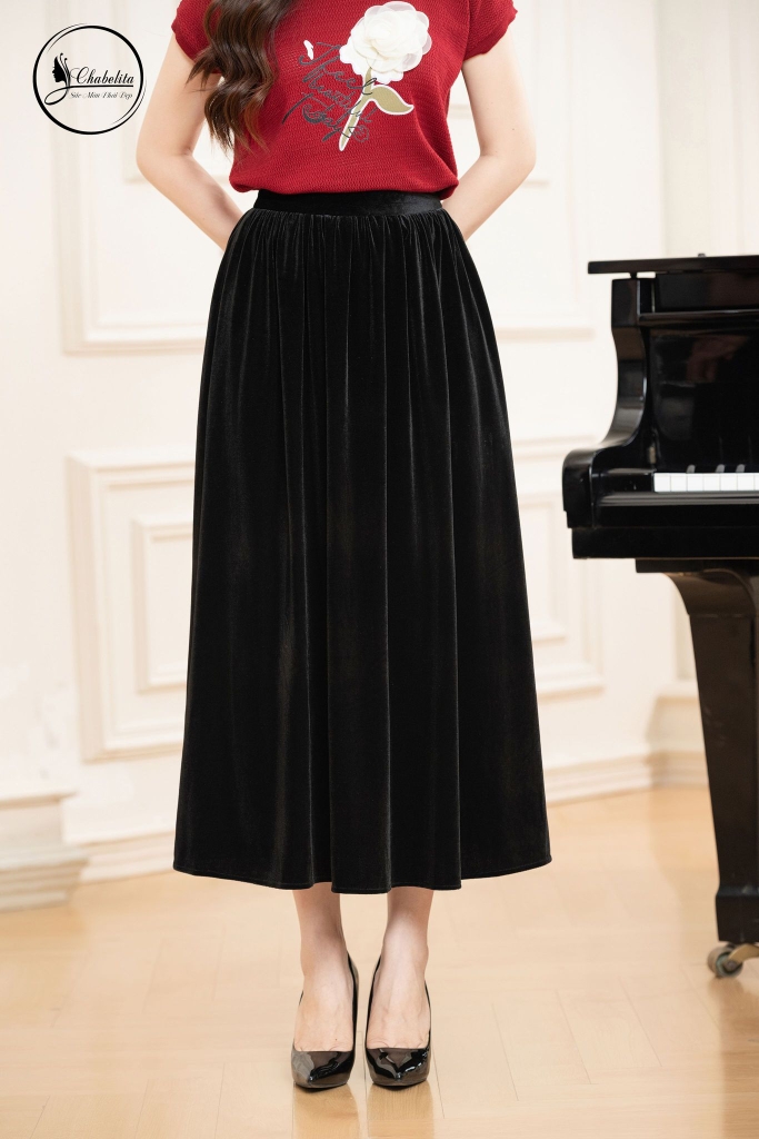 Chân váy xòe cạp cách điệu màu đỏ đô