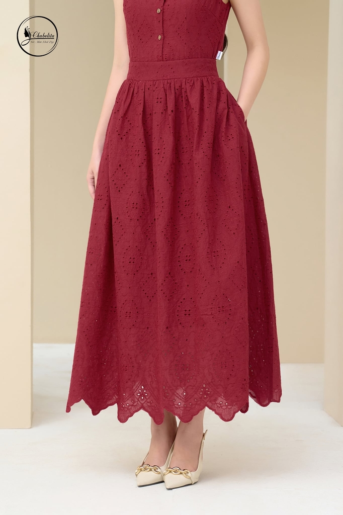 Chân váy xòe cạp cách điệu màu đỏ đô