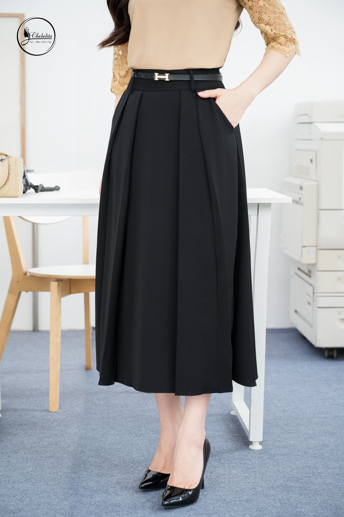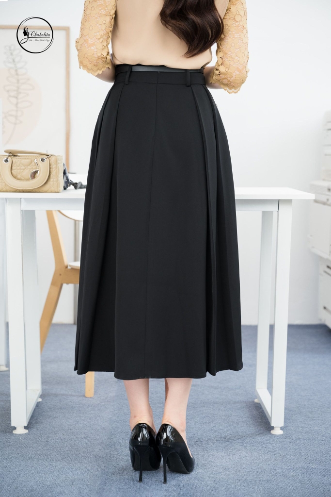 Chân váy xếp ly trước kèm đai màu đen