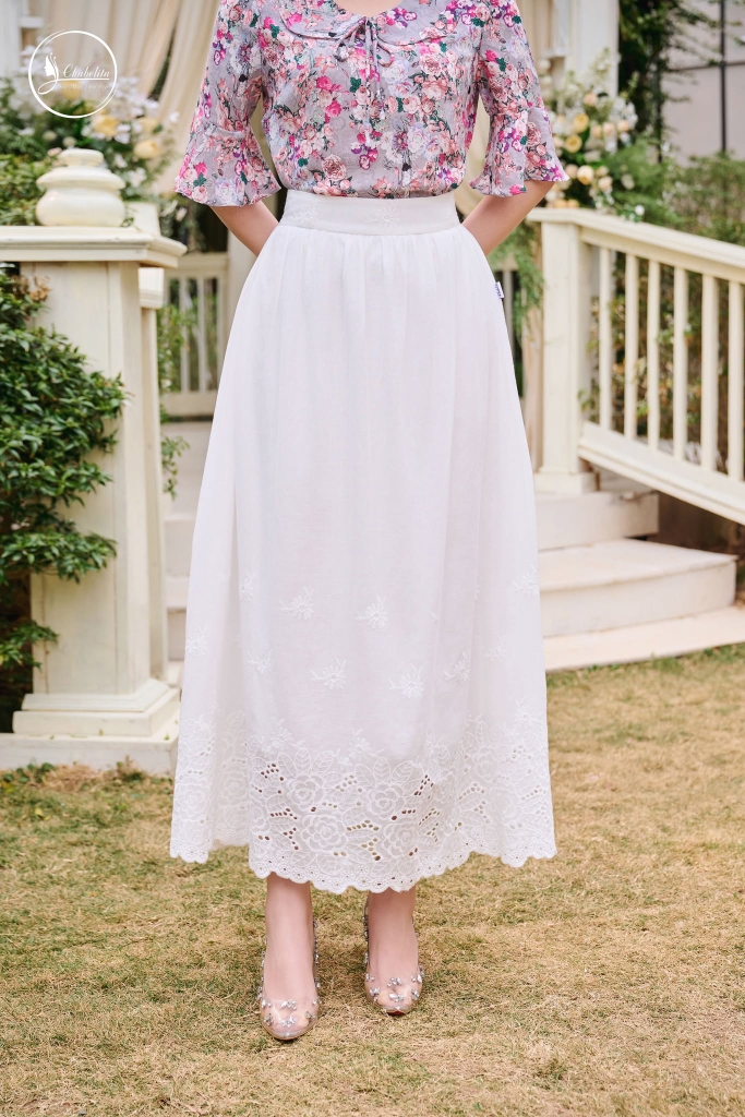 Chân váy xòe cạp cách điệu màu đỏ đô