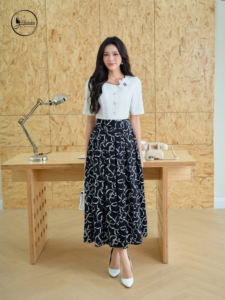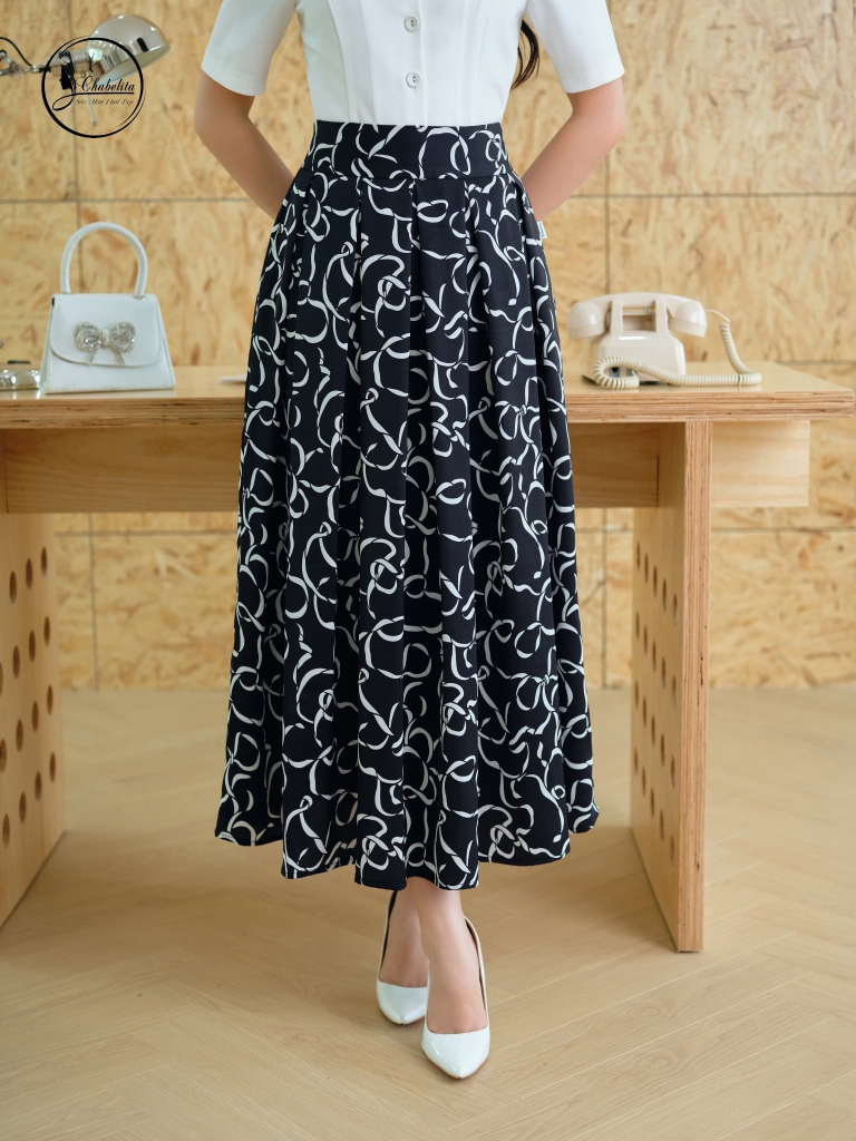 Chân váy xòe xếp ly họa tiết