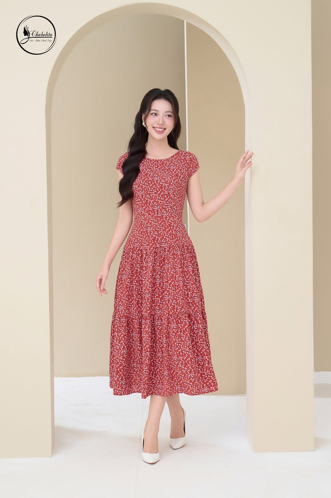 Đầm xòe tay cộc họa tiết hoa đỏ