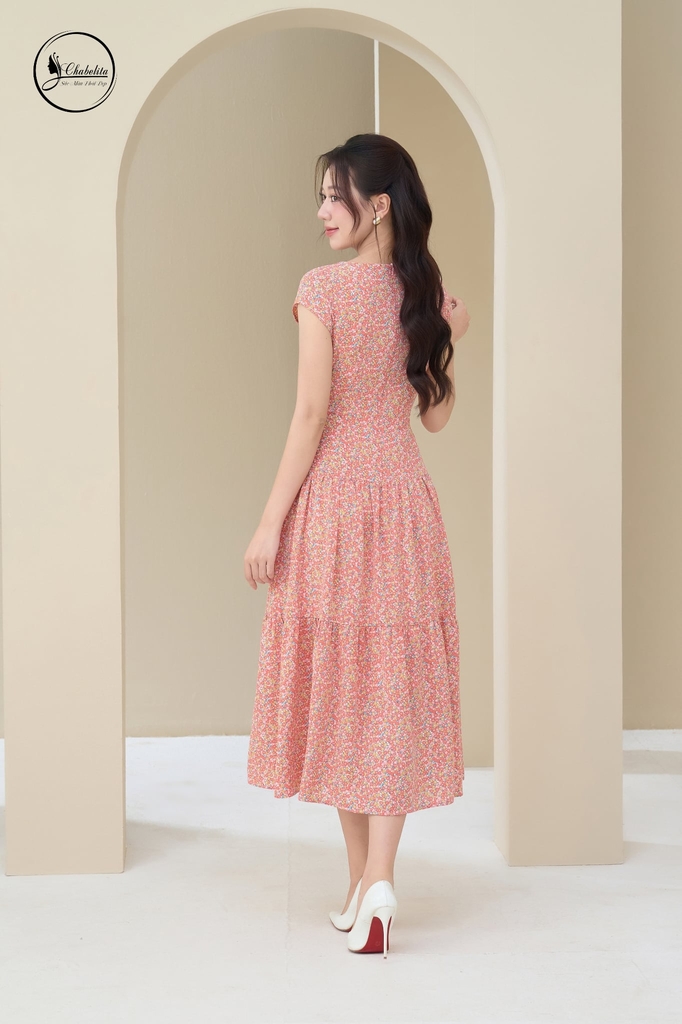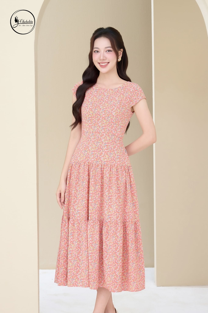 Đầm sát nách cổ tròn phối bèo hoa hồng