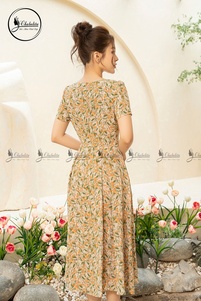 Đầm hoa vàng cổ vuông đính hoa ngực