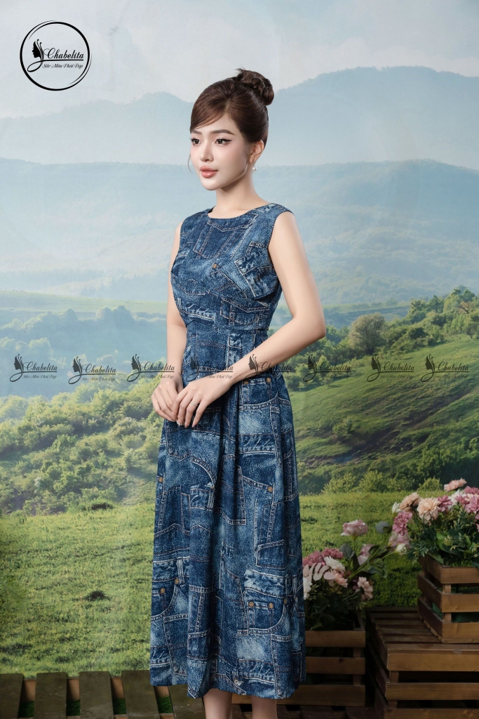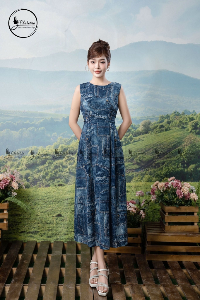 Đầm sát nách họa tiết phối dây chéo eo màu xanh