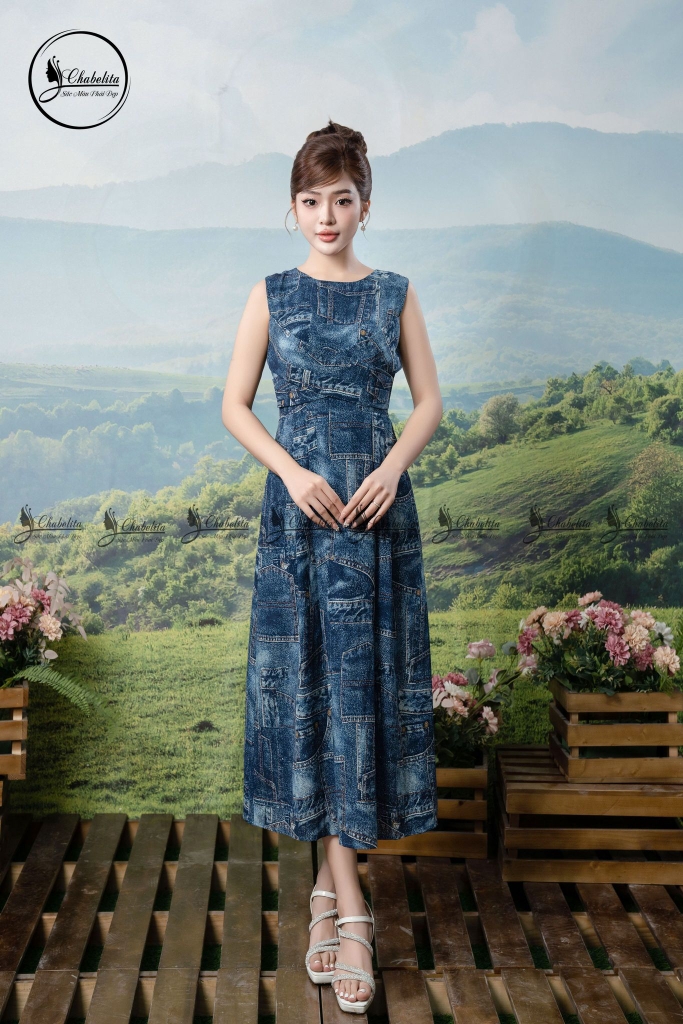 Đầm sát nách cổ tròn hoa nâu