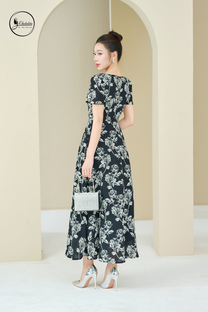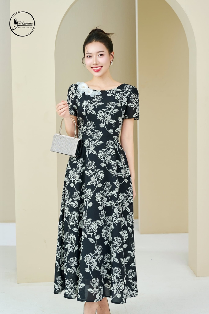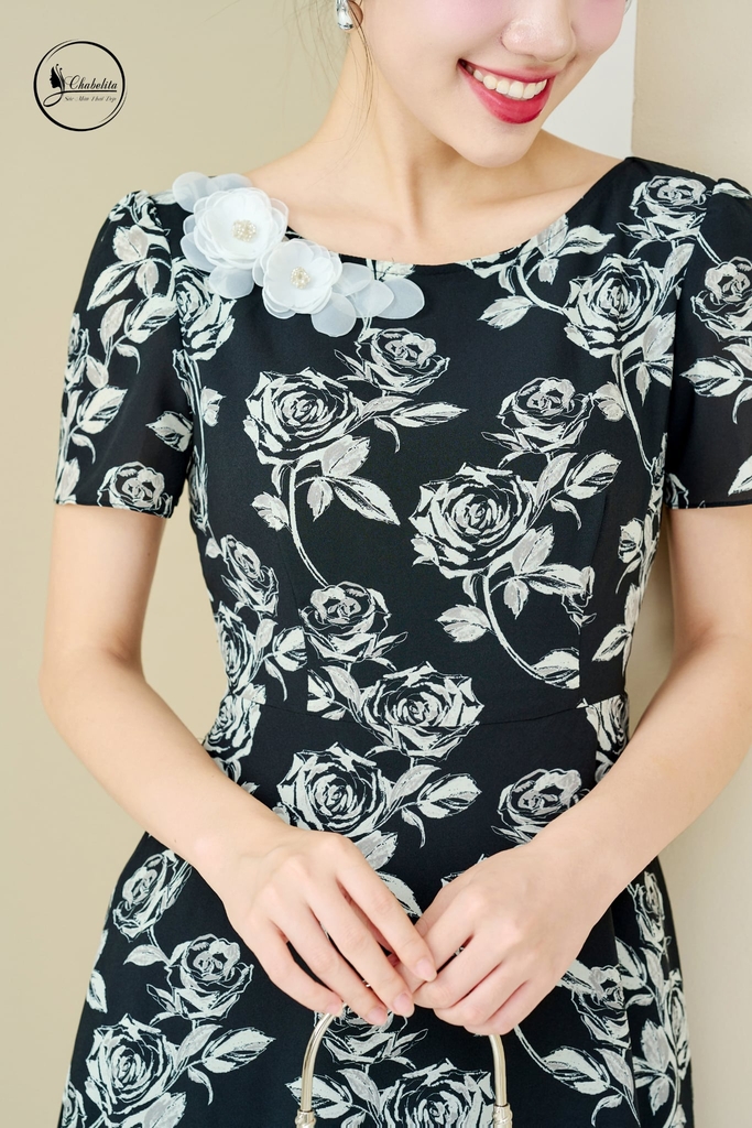 Đầm xòe tay cộc họa tiết hoa đỏ