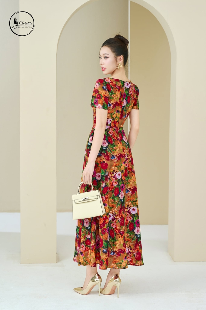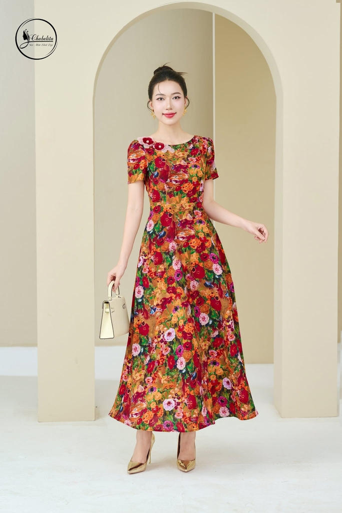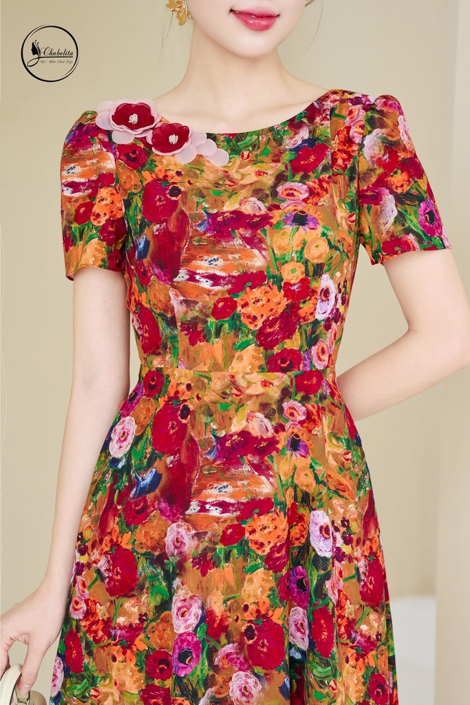 Đầm xòe tay cộc họa tiết hoa đỏ
