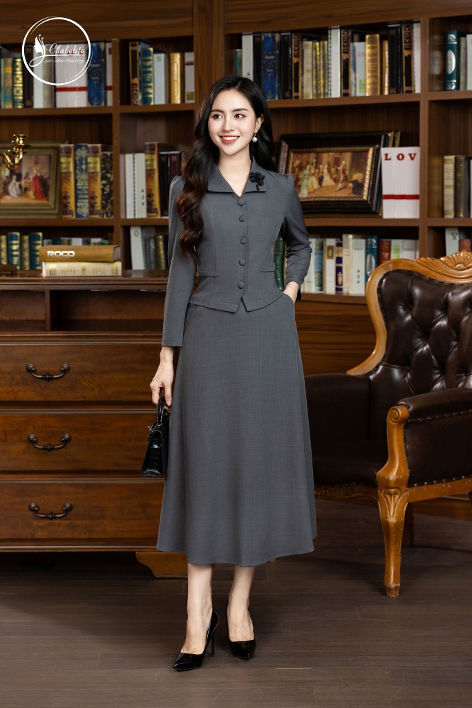 Sét bộ áo sơ mi phối chân váy màu ghi chì