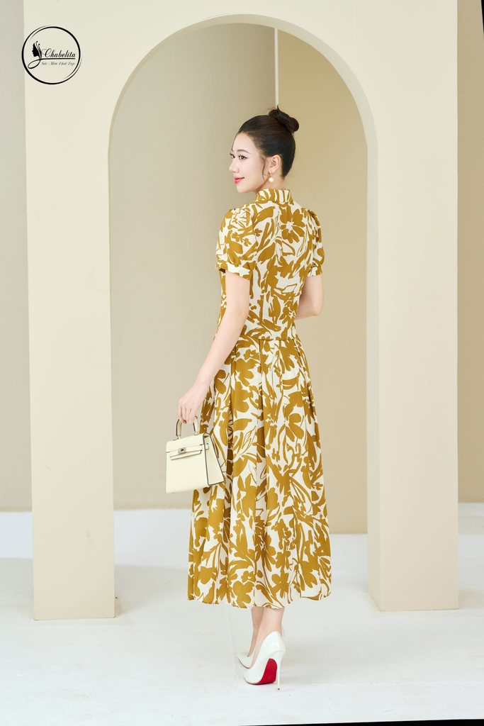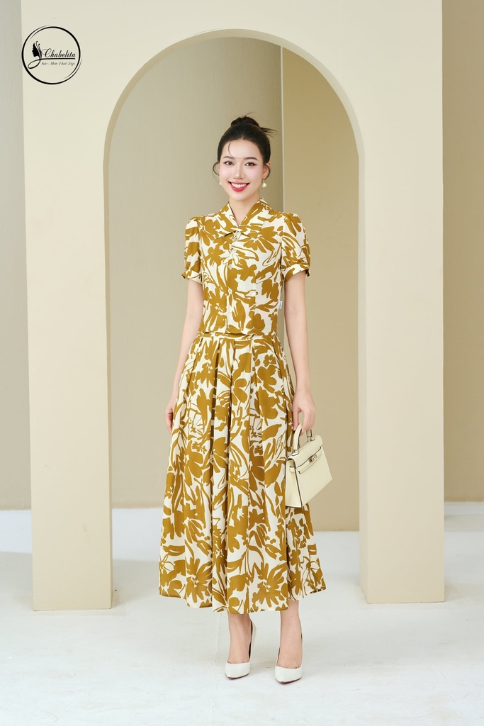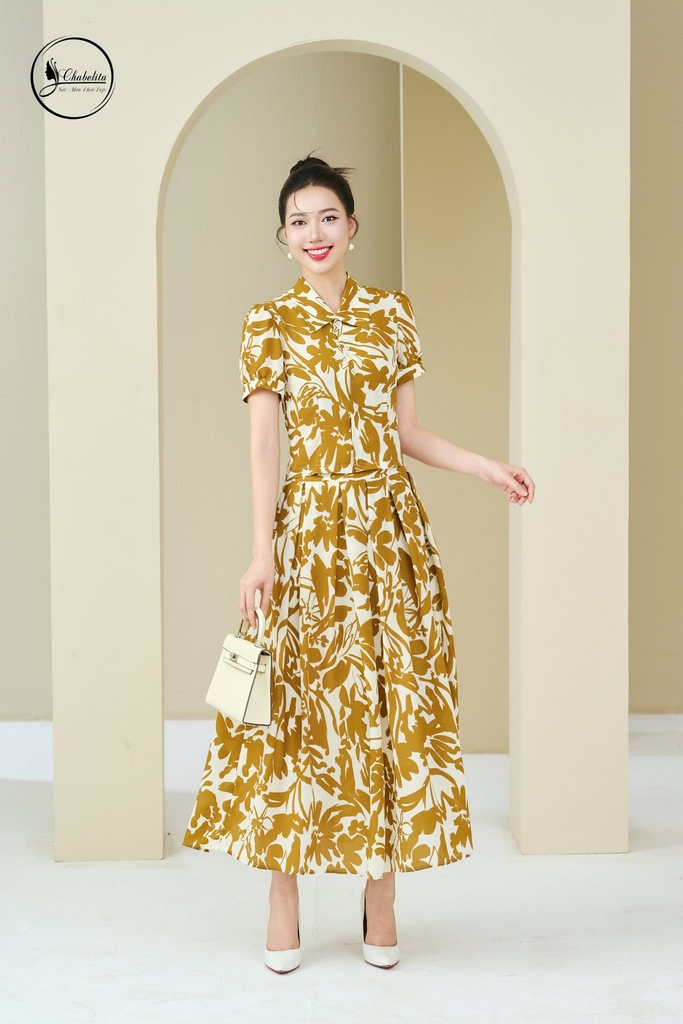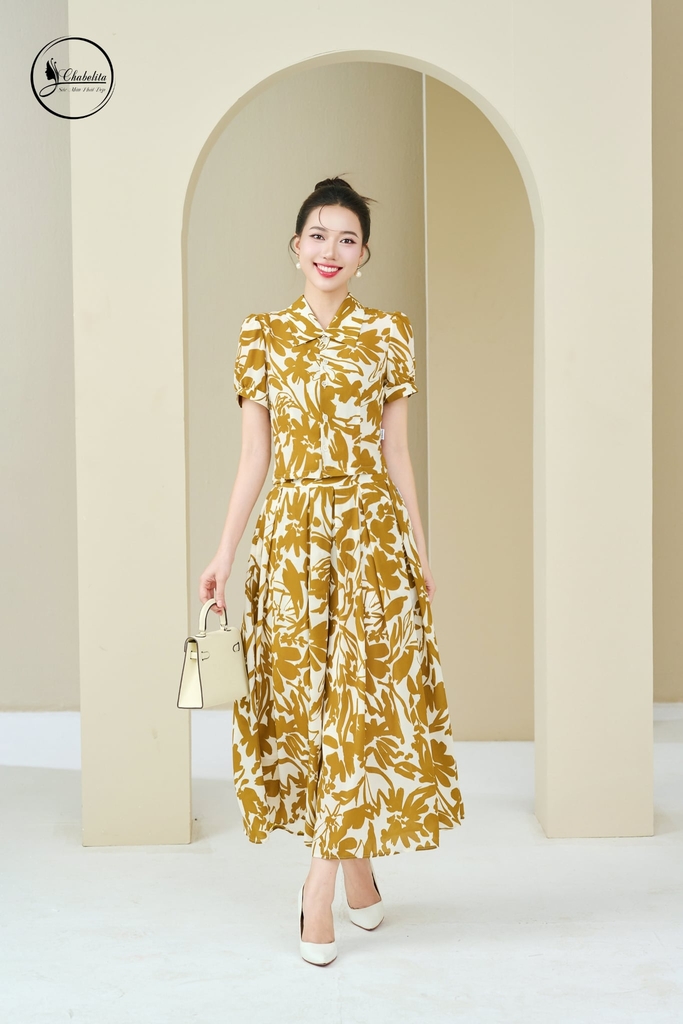 Sét bộ áo sơ mi phối chân váy màu vàng