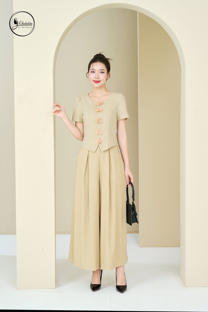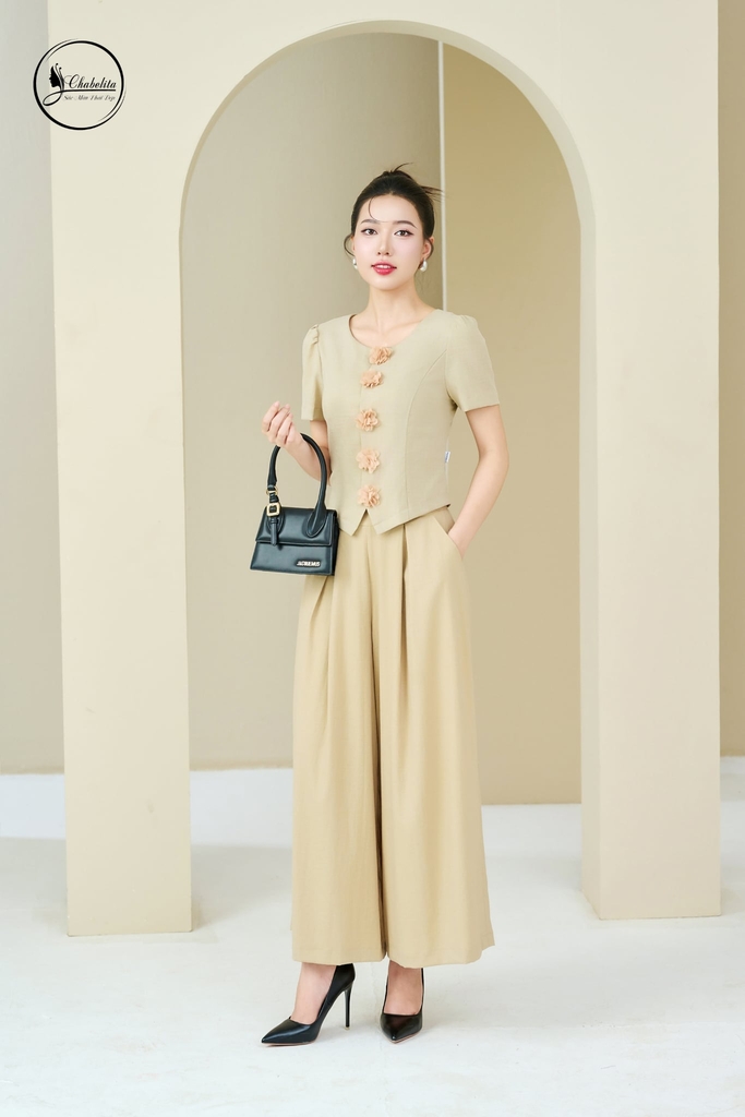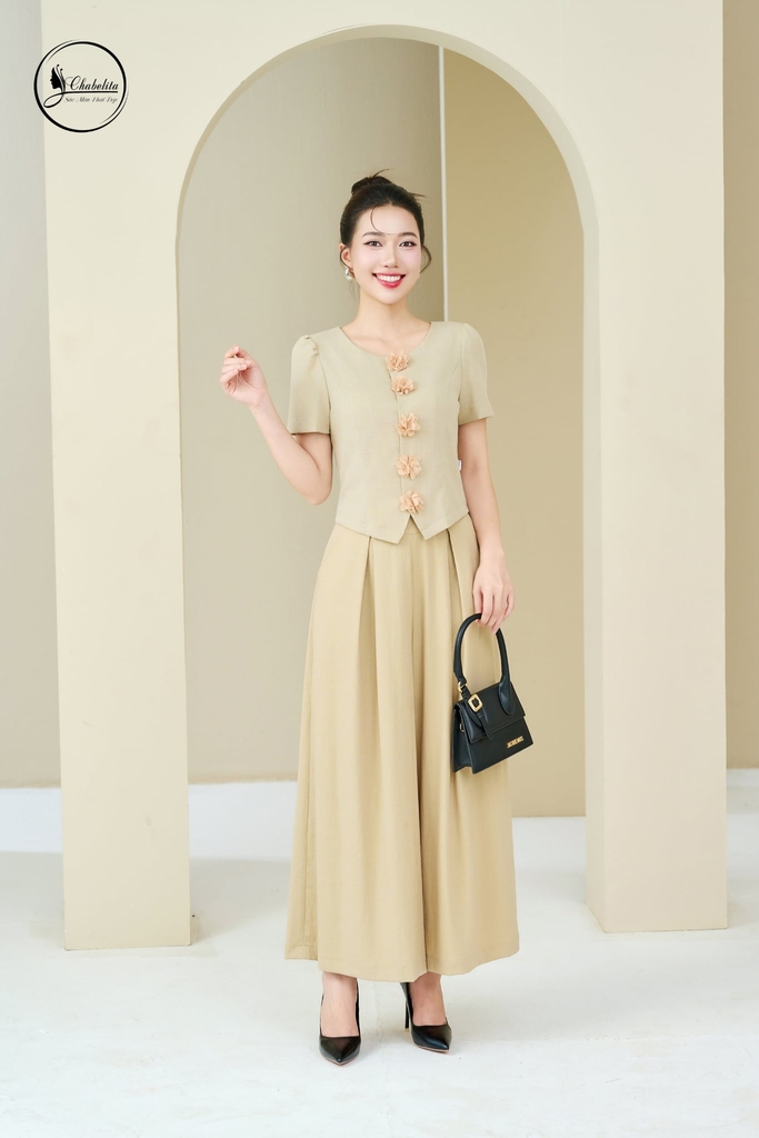 Sét bộ áo sơ mi tay cộc đính hoa nổi màu be