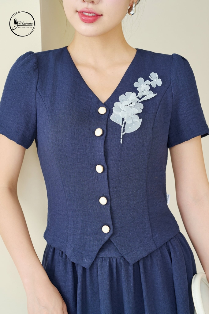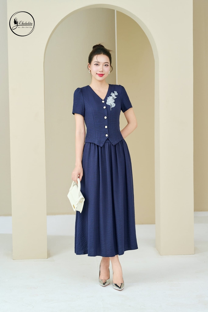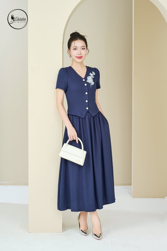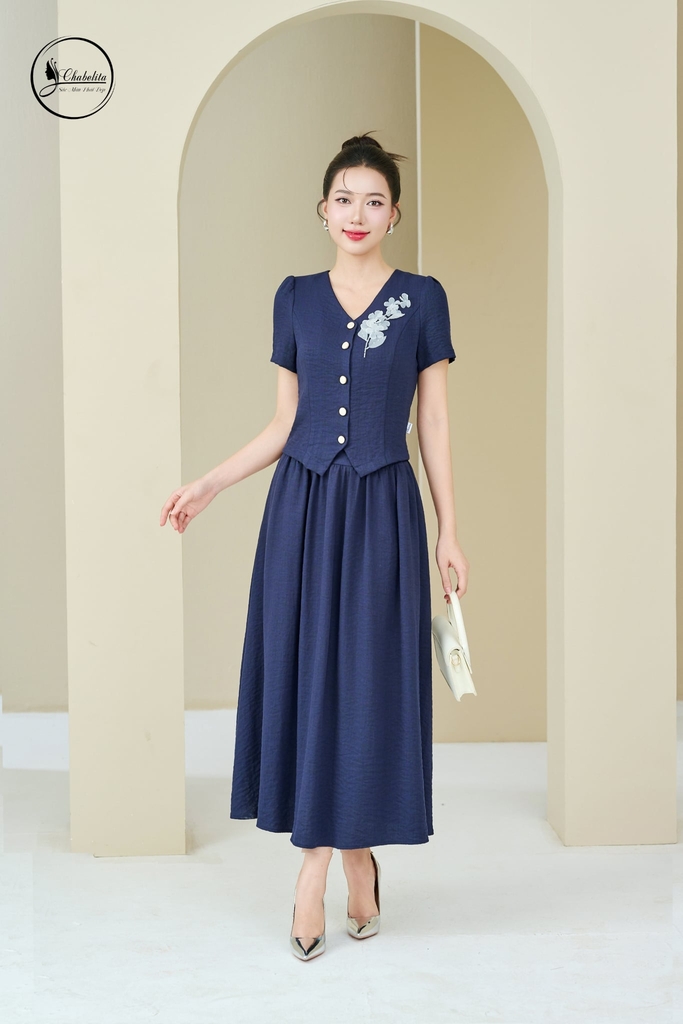 Sét bộ áo tay cộc cổ tim phối chân váy màu xanh than
