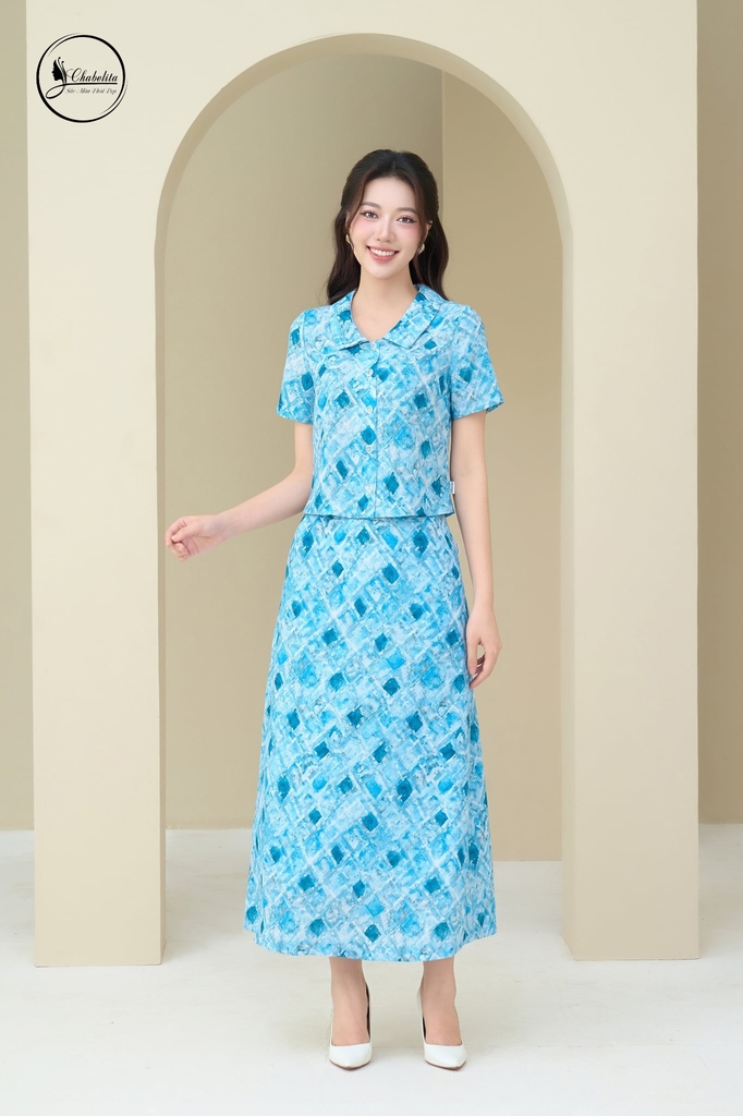 Sét bộ hoa áo sơ mi phối chân váy màu xanh